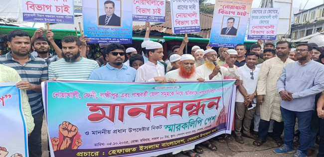 সেনবাগে নোয়াখালী বিভাগের দাবীতে মানববন্ধন ও বিক্ষোভ মিছিল অনুষ্ঠিত।