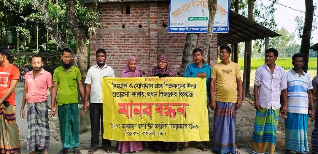 ফুলবাড়ীতে প্রতারণার শিকার শিক্ষকদের চাকরিতে পুনঃবহালের দাবিতে মানববন্ধন